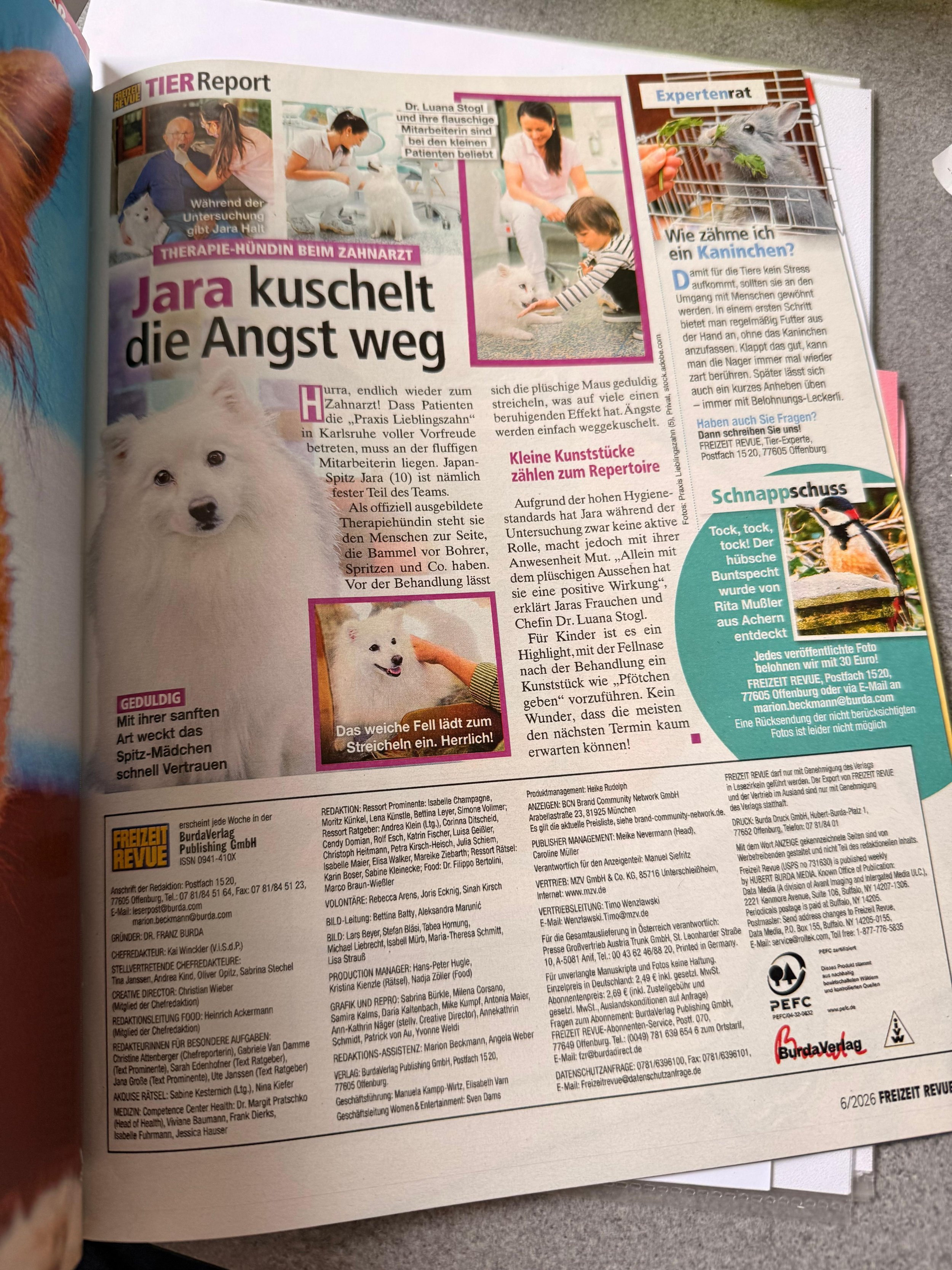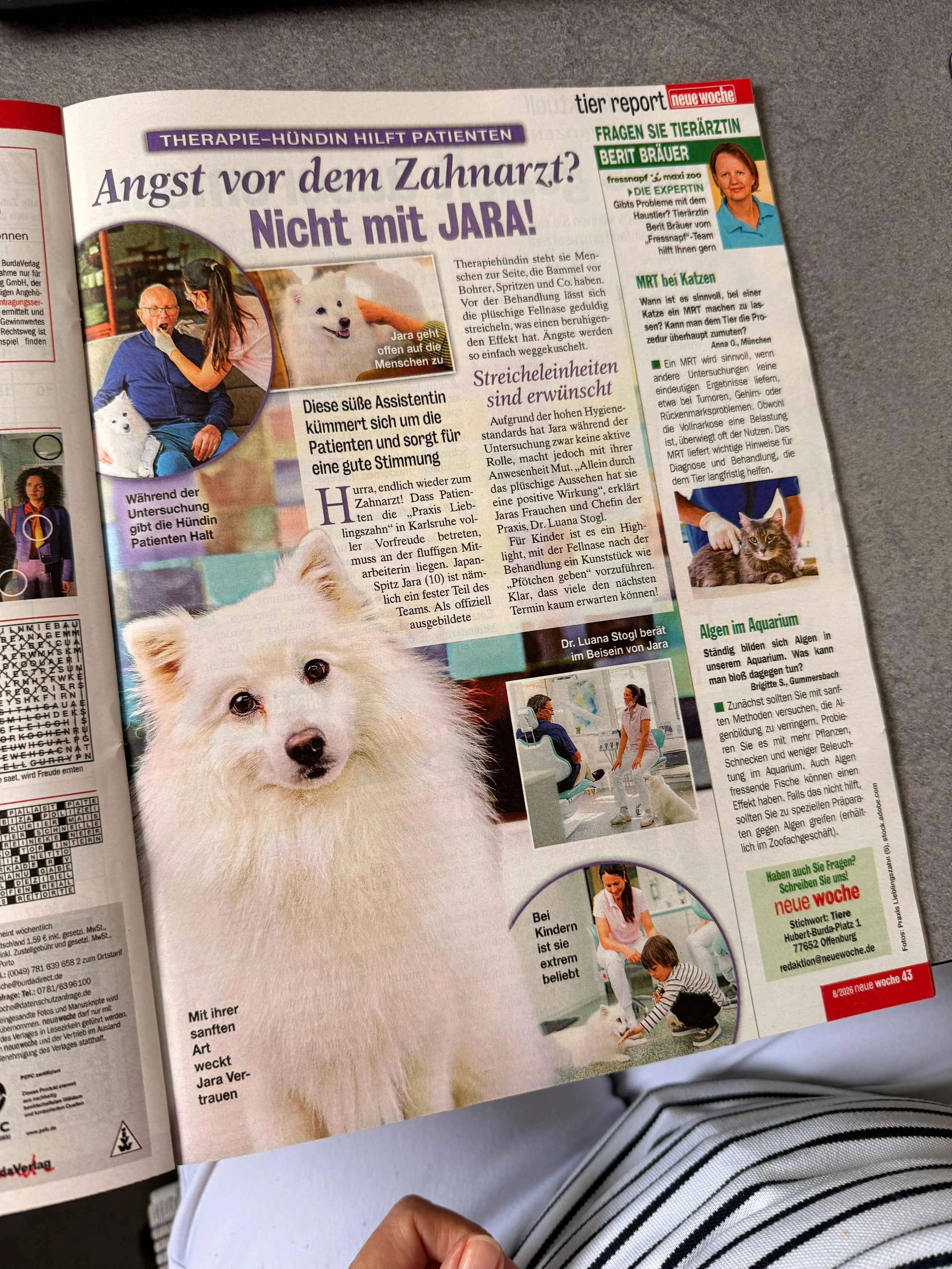 In der Praxis Lieblingszahn ist Therapiehündin Jara schon lange ein Superstar. Nun hat sie auch den längst überfälligen Sprung in ein “Promi-Magazine” geschafft und bleibt dabei, ganz Ihre Art super entspannt.