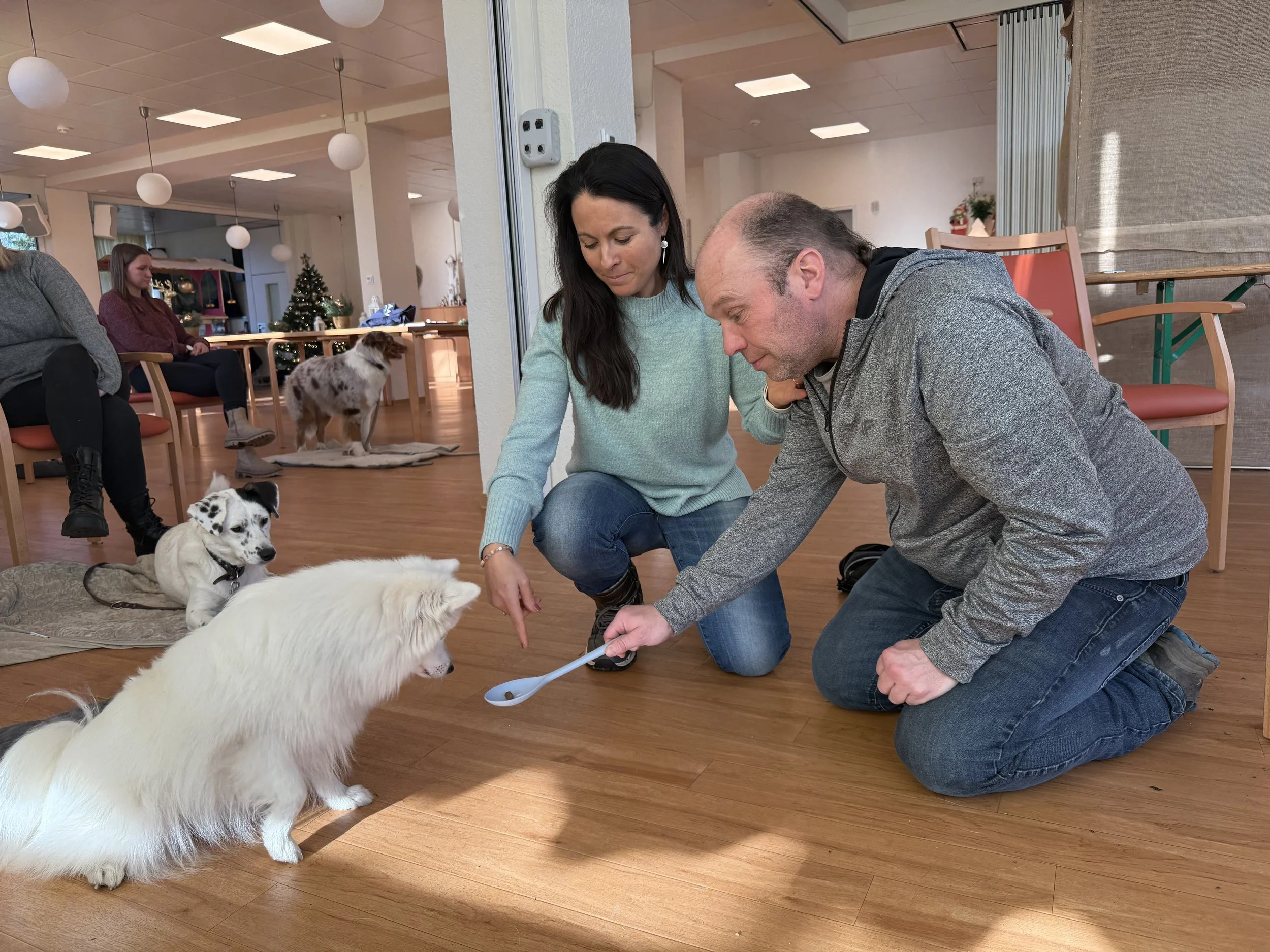 Elsa und Frauchen sind weiterhin für die Therapiehundeprüfung in der Hundeschule CanoIdea am Üben, Trainieren und Spass haben. Hier wird Elsa ein Leckerli angeboten, welches sie erst nach Freigabe nehmen soll.